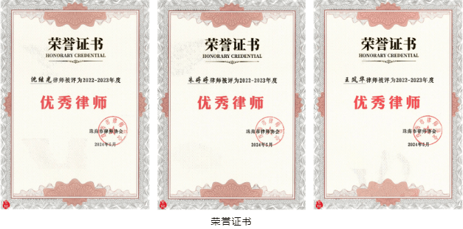 北京市京师(珠海)律师事务所荣获“2022-2023年度优秀律师事务所 ”,京师珠海律所管委会主任沈继光律师,党支部书记朱婷婷律师,党支部副书记王凤华律师荣获“2022-2023年度优秀律师”。