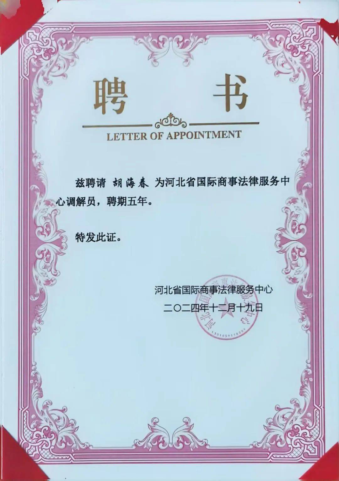 为更好地服务于境内外当事方纠纷化解,着力提升涉外商事法律服务水平,优化市场化法治化国际化营商环境,充分发挥商法中心化解商事纠纷的独特优势和职能作用,根据《中国国际贸易促进委员会调解中心授予调解员资格规定》等规定,河北省国际商事法律服务中心于2024年12月19日举办了调解员培训暨聘任大会。京师律师胡海春获聘河北省国际商事法律服务中心调解员,聘期五年。