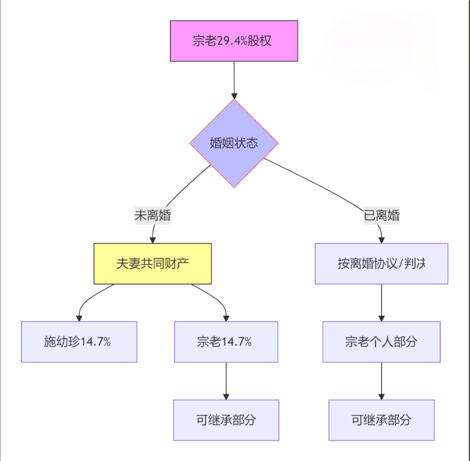 根据我国《民法典》婚姻编关于夫妻共同财产的规定,这29.4%的股份应属于宗庆后先生和施幼珍女士的夫妻共同财产,并非宗庆后先生一人所有。尽管该股份登记在宗庆后先生一人名下,但依据法律规定,其仍为夫妻共同所有。也就是说,该29.4%的股份中,一半份额即 14.7%属于施幼珍女士,另一半 14.7%才属于宗庆后先生个人所有。