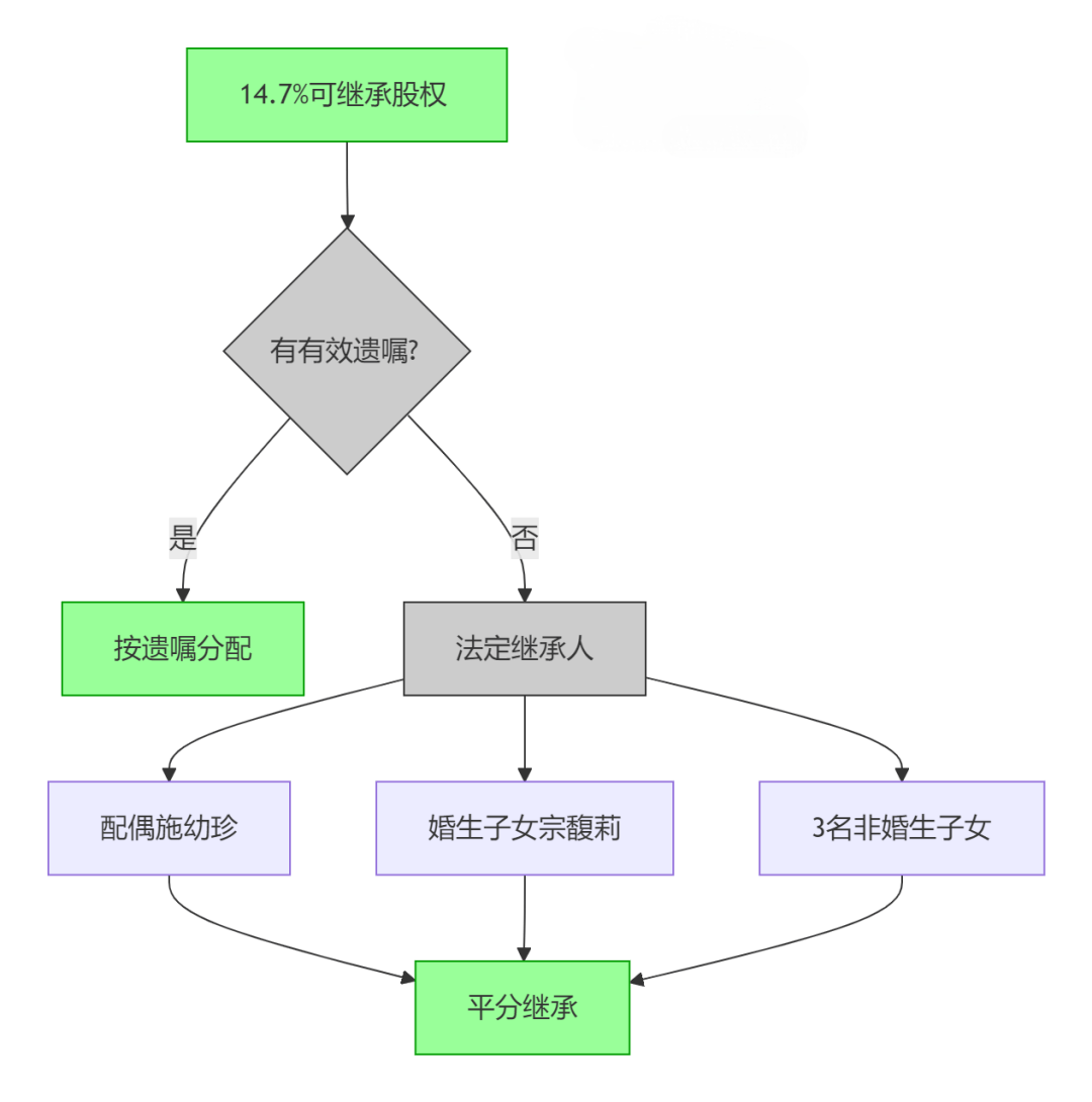 2、若宗庆后先生未留遗嘱或遗嘱无效,那么所有合法继承人(施幼珍女士、宗馥莉、3位非婚生子女)平分该部分股权。