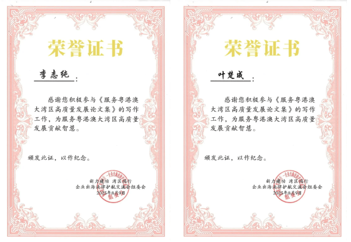 广东省新的社会阶层人士联合会律师行业分会副秘书长、珠海市新的社会阶层人士联合会律师分会副会长、北京市京师(珠海)律师事务所李志纯律师,珠海市新的社会阶层人士联合会律师分会副会秘书长、北京市京师(珠海)律师事务所叶楚成律师和滕冠诚律师参加本次交流会。李志纯律师、叶楚成律师获颁“积极参与《服务粤港澳大湾区高质量发展论文集》”荣誉证书,彰显了京师珠海律师对粤港澳大湾区 “一国两制三法域” 特殊背景下法律实务的深刻洞察与系统研究,更是对京师珠海律师专业深耕与研究能力的认可,为助力大湾区高质量发展贡献智慧与力量。