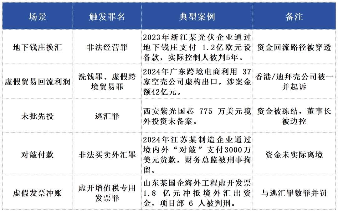 中国:刑法第 190 条(逃汇罪)、第 225 条(非法经营罪)以及 2024 年新增的第 222 条之一(虚假跨境贸易罪)。