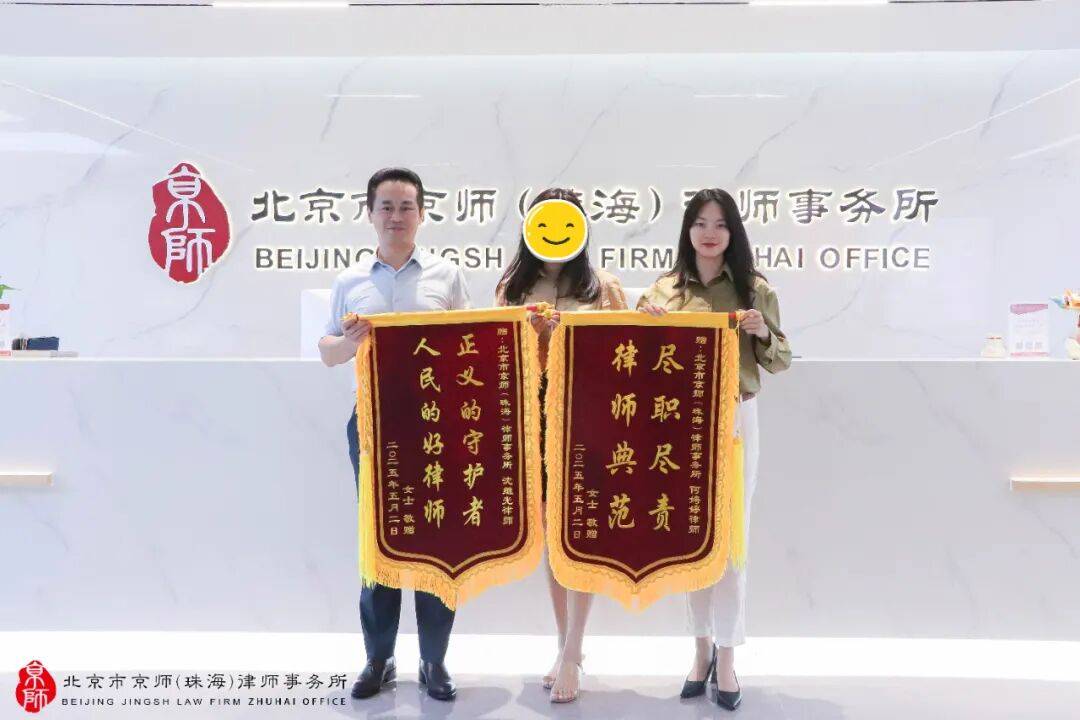10月16日,北京市京师(珠海)律师事务所管委会主任沈继光律师,青年律师工作委员会副主任何娉婷律师接受委托人张女士送来的“正义的守护者,人民的好律师”和“尽职尽责,律师典范”致谢锦旗,以感谢沈继光主任团队认真负责的工作态度及专业深厚的职业素养,让其合法权益得到及时、有效地伸张和维护。
