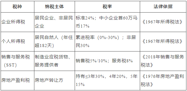 马来西亚税种结构简洁,核心税种包括企业所得税、个人所得税、销售与服务税(SST)等(见表1):
