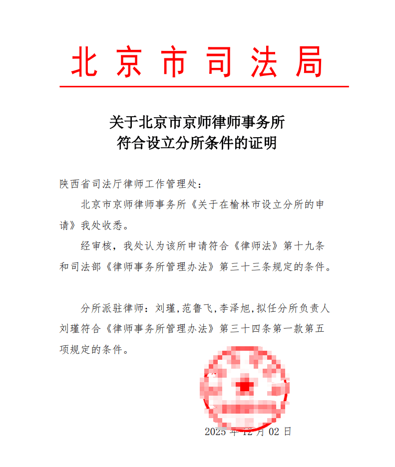 为纵深推进规模化高质量发展战略,织密全体系服务网络、深化区域协同能力,京师律所于2025年中开始积极推进榆林分所的筹备工作。经充分考察当地市场与行业态势,近日,我所正式向北京市司法局提出在榆林市设立分所的申请。经北京市司法局审核,认为我所申请符合条件,并于2025年12月2日出具《关于北京市京师律师事务所符合设立分所条件的证明》,彰显出京师律所进一步开拓西北法律服务市场的战略之志,更意味着将肩负起服务榆林经济社会发展、助力当地法治化营商环境建设的重要责任。