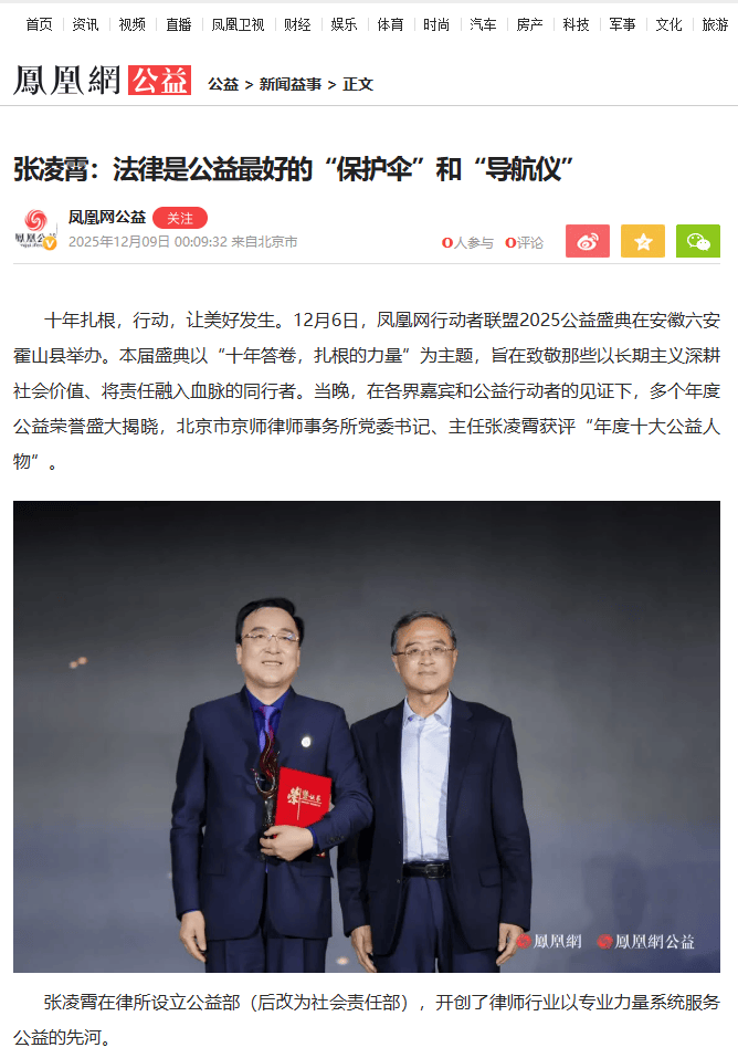 近日,凤凰网“行动者联盟2025公益盛典”在安徽六安霍山县隆重举行。北京市京师律师事务所党委书记、主任张凌霄凭借其在公益法治化领域的长期深耕与突出贡献,获评“年度十大公益人物”。在采访中,张凌霄主任深入阐释了“法律是公益最好的‘保护伞’和‘导航仪’”这一理念,分享了京师律所以专业力量推动公益行业走向法治化、专业化的实践与思考。