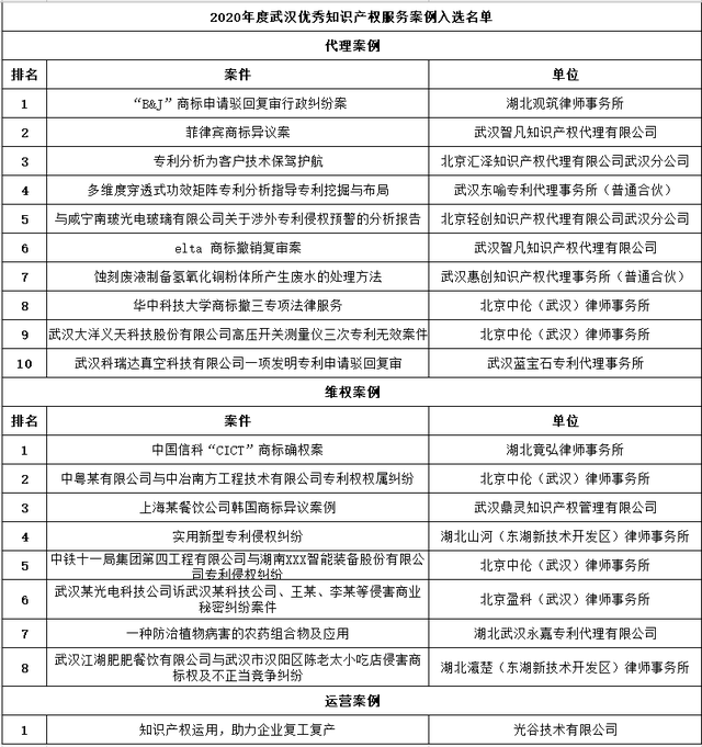 2、2020年度武汉优秀知识产权服务案例入选名单